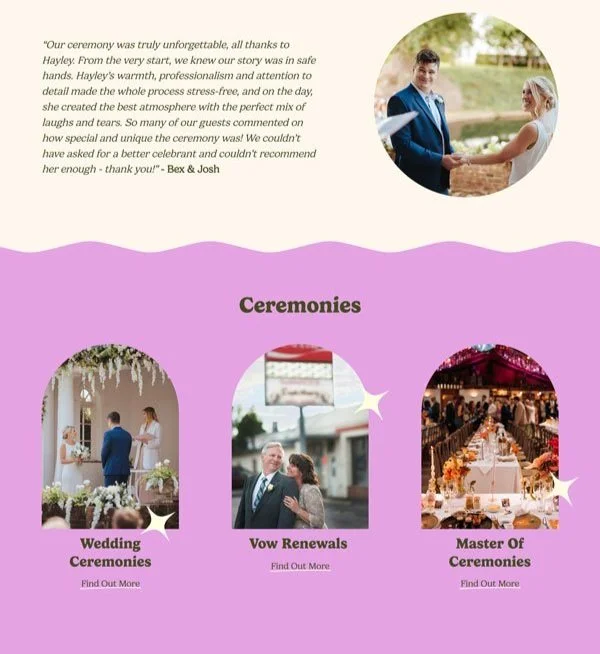 Hayley’s website is a vibrant reflection of her personality—bright, bold, and full of life. Designed to stand out just like her ceremonies, the site throws out tradition in favour of something far more personal, playful, and real. Every colour pop, playful font, and unexpected detail is there to reflect Hayley’s mission: to ditch the cookie-cutter script and co-create ceremonies filled with love, laughter, and—most importantly—you. This isn’t your average wedding site, because Hayley isn’t your average celebrant.